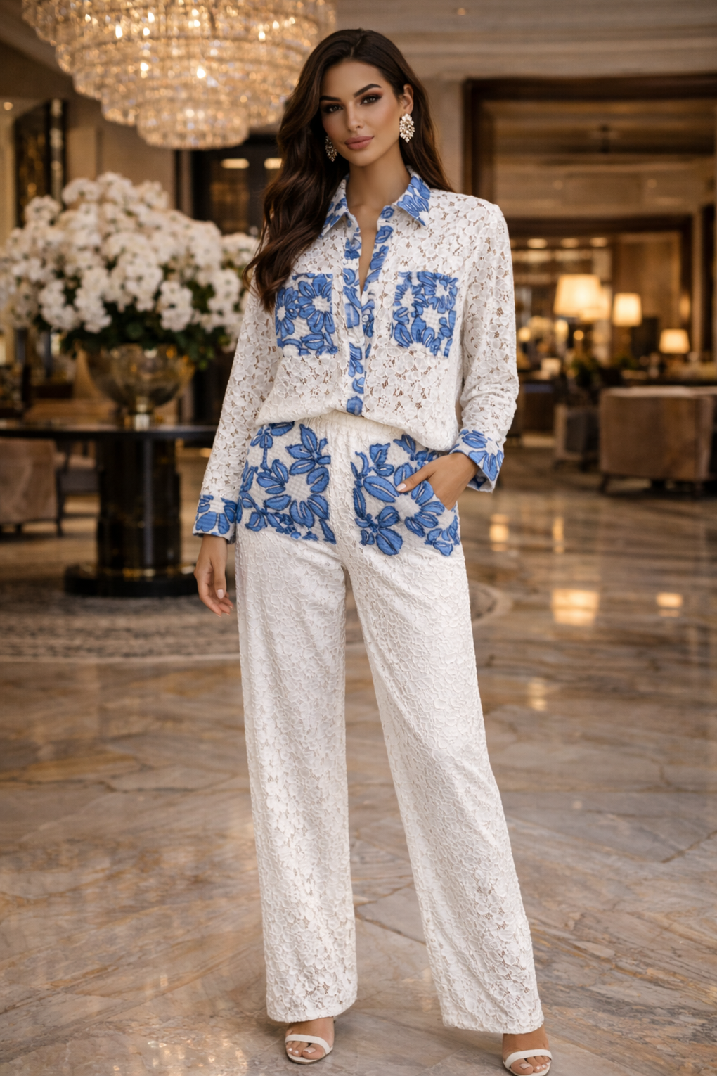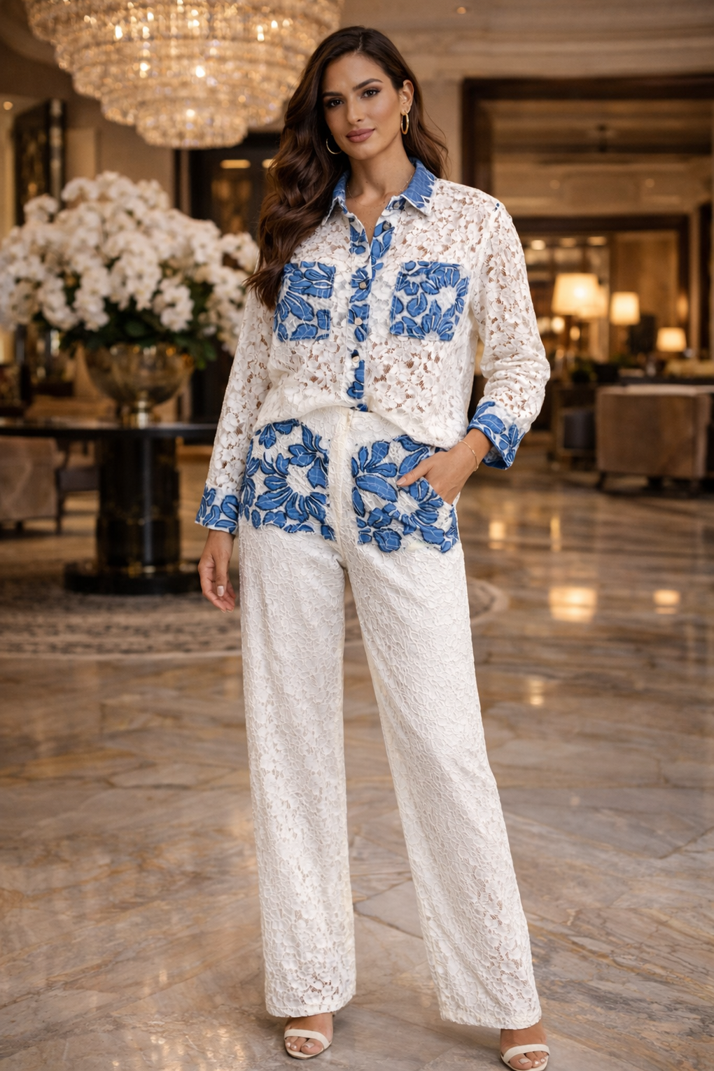 WHITE SET LACE AND BLUE PRINT